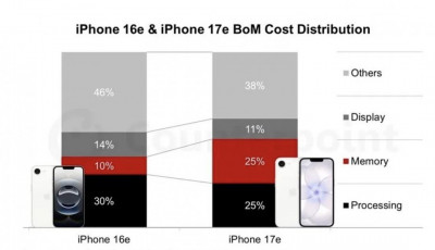根據市調機構最新報告,iPhone 17e的物料成本比上一代iPhone 16e增加15.6%,其中變化最明顯的就是記憶體成本,從原本佔整體成本的10%大幅提升至25%,幾乎追平處理器的成本比重,成為這次成本上升的最大原因。