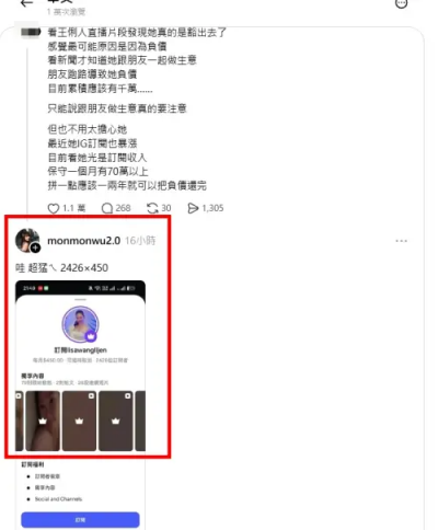 一名網友就在Threads發文,直言:「看王俐人直播片段發現她真的是豁出去了,感覺最可能原因是因為負債」,不過他認為外界也不用太擔心王俐人,「最近她IG訂閱也暴漲,目前看她光是訂閱收入,保守一個月有70萬以上,拼一點應該1、2年就可以把負債還完」。
