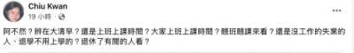 邱瓈寬(寬姐)今日在臉書回應ONE OK ROCK大巨蛋演唱會遭抗議一事,「阿不然?辦在大清早?還是上班上課時間?大家上班上課時間?翹班翹課來看?還是沒工作的失業的人、退學不用上學的?退休了有閒的人看?」認為演唱會就是配合多數人有空的時間才舉辦,若是辦在大白天是沒有人要看的。