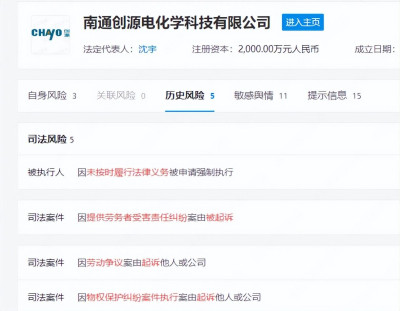 此外,企查查顯示,南通創源有5條司法風險,並曾因未按時履行法律義務被申請強制執行。