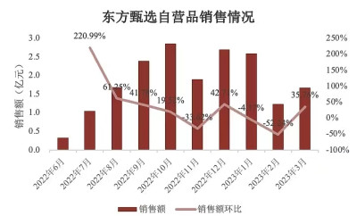 然而隨着疫後出行措施進一步放寬,直播電商業務逐漸失去活力,東方甄選增速明顯放緩,業績表現不佳。海通證券數據顯示,2023年1-3月,東方甄選月均GMV跌下2000萬元,月均觀看人次跌破千萬,遠低於2022年6~12月。