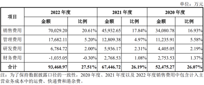 值得一提的是,乖寶寵物的銷售費用較高且持續增長,其中2022年更是突破了7億元的關口。報告期各期,該公司的銷售費用分別爲3.41億元、4.59億元和7.00億元,佔各期營業收入的比例分別爲16.93%、17.84%和20.61%。