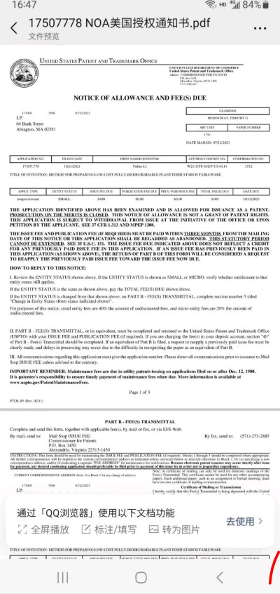 $運鴻CTI(NASDAQ|CTIB)$ 這個文件應該是吹保向美國商標專利局申請專利授權其發給吹保的答復函三頁其中的一頁,大概意思是吹保的專利可以在美國商標局申請,但是回復函第一段明確說明了THIS NOTICE OF ALLOWANCE IS NOT A GRANT OF PATENT RIGHTS (這是一許可通知不是授予專利權)其余大概內容是告知必須在規定郵件發出去後三個月內必須繳納相關費用,超期視爲自動放棄申請