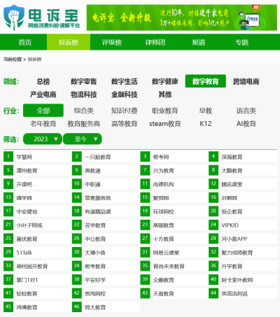 據國內知名網絡消費糾紛調解平台“電訴寶”(315..CN)顯示,2023年至今,“電訴寶”受理投訴中涉及的在线教育平台按投訴量依次爲學慧網、一只船教育、幫考網、深海教育、潭州教育、高教通、興爲教育、大鵬教育、开課吧、中職通、尚德機構、騰訊課堂、常青藤爸爸、聚師網、中安建培、有道精品課、恆企教育、小葉子陪練、芸學教育、高頓教育、VIPKID、賽優教育、中公教育、十方教育、51Talk、大塘小魚、網易雲課堂、聚力成師教育、神州國开教育、幫考教育、育尚未來教育、升學教育、掌門1對1、平安好學、衆趣教育、阿卡索外教網、輕輕教育、思鴻網校、天普教育、英語流利說、鴻博教育、師大教育等。