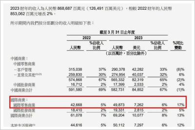 2023財年阿裏中國商業零售業務收入5653.32億元,同比下滑了1.7%,這部分收入佔比65%,依然是支撐阿裏業績的基石。