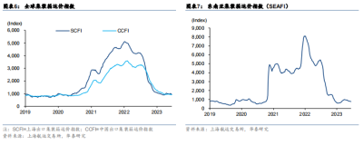 分航线看,截至 6 月 23 日,傳統航线如上海至歐洲/上海至美西/上海至美東運價相比 22 年高點下跌 90%/84%/82%;相比 2019 年均值+6%/-21%/-20%。新興市場方面,年初至今 中東/南美/西非運價呈現觸底回升態勢,其中上海至中東/上海至南美/上海至西非運價(截 至 6 月 23 日)較 22 年高點下跌 65%/77%/84%;相比 2019 年均值增長 68%/42%/11%, 即期運價仍大幅高於疫情前水平。