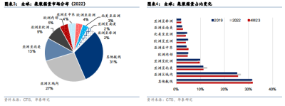 集裝箱貨運量方面,根據 CTS 數據,2022 年亞洲區域內/亞洲至北美/亞洲至歐洲爲全球集 裝箱海運市場最重要的出口航线,以上航线的貨量佔比全球集運貨量的 26.7%/12.8%/8.9%; 亞洲至中東/亞洲至南美/亞洲至非洲佔比全球集運貨量的 4.4%/2.4%/1.8%。2023 年 1-4 月, 亞洲至北美/亞洲區域內累計貨量佔比同比下降 1.6pct/1.2pct;亞洲至歐洲/亞洲至中東/亞 洲至南美/亞洲至非洲佔比同比上升 0.7pct/0.6pct/0.3pct/0.2pct。