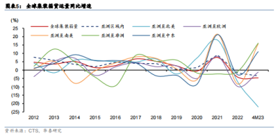 根據 CTS 數據,2023 年 1-4 月全球集裝箱累計海運量同比下滑 4.6%,降幅擴大(22 年全 球貨量同比下滑 4.2%),主因 1-2 月中國疫情以及北美市場仍處於去庫存周期影響。