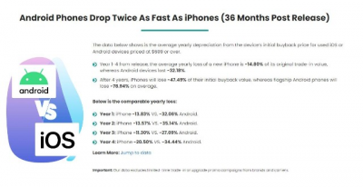 再從實際數據來看,第一年iPhone折舊率13.83%,而安卓手機折舊率32.06%;第二年iPhone折舊率13.57%,而安卓手機折舊率35.14%;第三年iPhone折舊率11.30%,而安卓手機折舊率27.09%;第四年iPhone折舊率20.50%,而安卓手機折舊率34.44%。能夠發現,在最开始的2年時間裏,蘋果iPhone的折舊率要遠低於安卓手機。