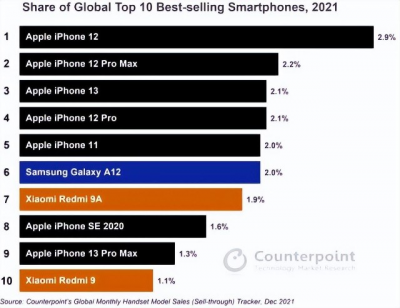 要知道,在Counterpoint發布的上一年的相同榜單上,小米還憑借着紅米9與9A殺入前十。不過,這一年蘋果的統治地位相對更加明顯,共有7款機型上榜,其中同樣包括2022年的“暢銷霸主”iPhone13。而在這一年,三星也有一款上榜機型,但並沒有出現榮耀與vivo、OPPO的相關機型。