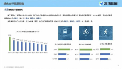 基於公交地鐵、騎行和步行路线規劃佔總規劃次數的比例,規範化後得出各城市的“綠色出行意愿指數”。2023Q2期間,綠色出行意愿最強的城市爲北京市,其次爲上海市、西安市、南京市。鼓勵健康環保綠色出行,共同推動城市環境的改善和可持續發展。