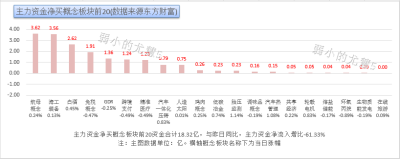 解讀:主力資金淨买概念板塊前20資金合計18.32億,與昨日同比主力資金淨流入增比-61.33%。