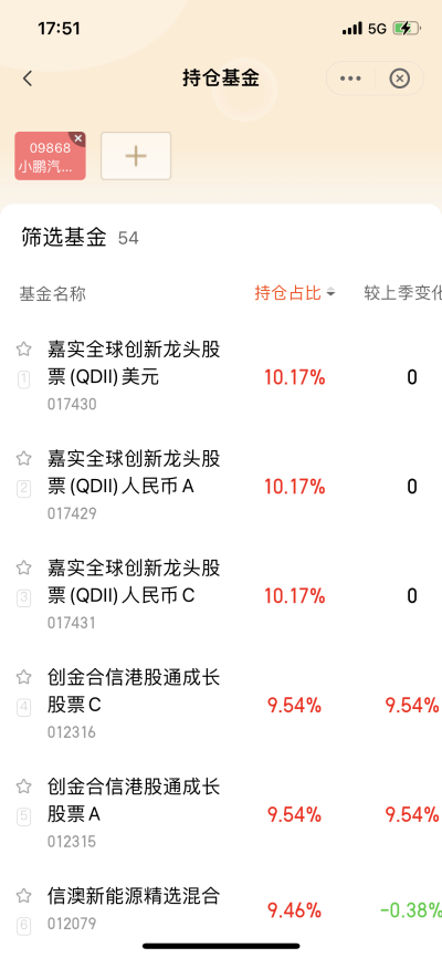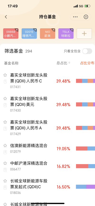 然後看看誰重倉了造車新勢力這個板塊,以蔚來(美股)+理想(港股)+小鵬(港股)+特斯拉(美股),搜索最近的630的持倉,結果如下: