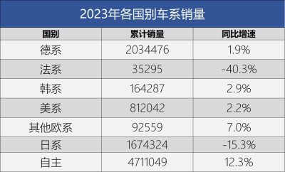 首先還是來看看銷量,根據乘聯會公布的數據,2023年國內合資品牌累計零售銷量約480萬輛,同比下滑4%。而具體到品牌國別來看,日系與法系上半年銷量同比分別下降15.3%和40.3%,而德系等其他合資品牌則依舊實現了同比小幅上漲,但也依舊難以改變市場整體份額下滑的局面。