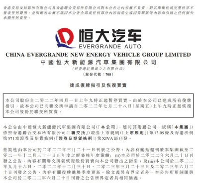 27日晚間,恆大汽車公告稱,公司股份自2022年4月1日上午9時正起暫停买賣。由於公司已達成所有復牌指引,故公司已向聯交所申請自2023年7月28日(星期五)上午9時正起恢復公司股份於聯交所买賣。