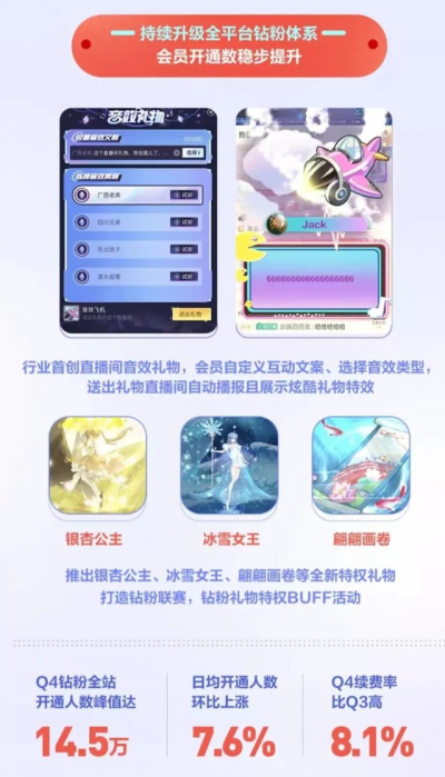 第四季度,鬥魚在“鑽粉體系”“粉絲家園”等玩法的基礎上,繼續對鑽粉會員體系進行迭代,上线了會員音效和特權禮物,打造了鑽粉聯賽、鑽粉禮物特權Buff等活動。