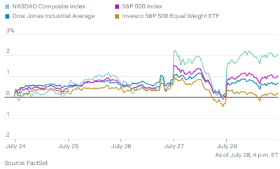勞舍爾仍然看好大型科技公司,微軟(MSFT)、Meta Platforms (META)、特斯拉(TSLA)和Alphabet (GOOGL)上周公布的財報表現都不錯,但還不足以帶動所有股票走高。