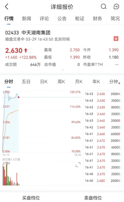 中天湖南集團(02433)將於3月30日(周四)在香港掛牌。在華贏證券今日暗盤交易中,該股表現搶眼!暗盤交易顯示最高一度來到2.75港元,較招股價1.18港元漲逾129%。每手2000股,不計手續費,每手賺約3140港元。截至發稿,股價略有回落。