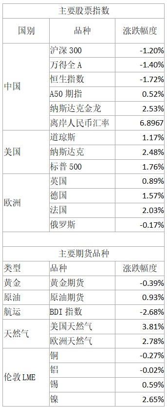 隔夜主要股票指數和期貨品種漲跌
