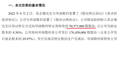 根據公告得知大股東轉讓給華潤數科只有 50,573,000 股,吳志雄現有的未質押股份大於將要轉讓的股份!