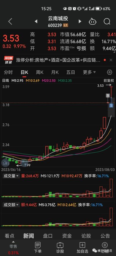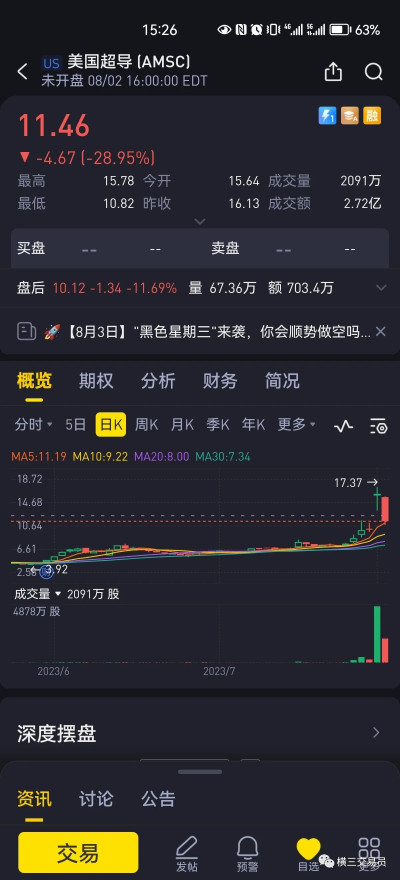 三,交易方面,按照盤前操作計劃,开盤雲南城投表現不及預期,則在早盤封單減少時板砸,獲利10%,金科股份低吸高拋做T,昨晚見最火題材超導概念美股龍頭美國超導(AMSC)大幅下跌,即用SELL STOP手法做空,目前浮盈18%。