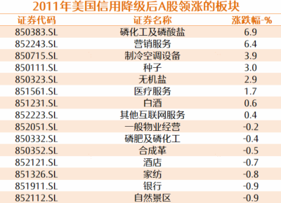 我們統計了上一輪美國信用評級下降後一個月內,A股各個板塊的表現,農化、消費股、銀行股表現較爲突出。220個三級行業中,僅有磷化工、營銷服務、空調設備、種子、無機鹽、白酒、醫療服務等板塊上漲,超過200個板塊下跌,A股出現大幅回落。跌幅在1%以內的板塊僅有7個,消費板塊(酒店、家紡、銀行、自然景區)成爲主流。