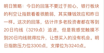明日策略:今日的回落沒有抵達20日均线就开始拉升,老投資者這個位置是不敢追加進去的,买入的機會都沒有。這個位置還不能看空,沒有利空的出現,不要想着指數回下來,繼續看震蕩向上。明日指數壓力位3300點,支撐位爲3247點。
