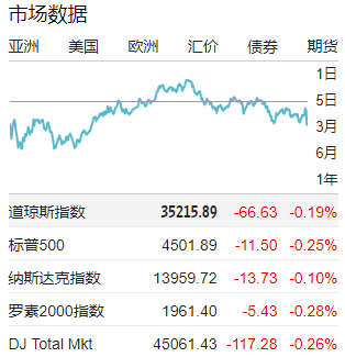 美國股市周四小幅走低,延續了最近的跌勢,因爲國債收益率上升打壓了市場的風險偏好。標普500指數下跌0.3%,道瓊斯指數下跌66.63點,跌幅0.2%。以科技股爲主的納斯達克綜合指數下跌0.1%。長期美國國債收益率繼續走高,促使投資者重新審視其資產配置。基准的10年期美國國債收益率從周三的4.077%攀升至去年11月以來的最高水平4.188%。30年期美國國債收益率從一天前的4.164%升至4.304%。