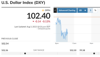 美元指數盤中一度漲至102.85的日內高點,創近四周來新高,但在美盤時段回吐全部漲幅,最終收跌0.1%,報102.48。