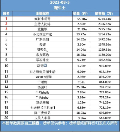 8月5日,抖音直播達人帶貨榜一是瘋狂小楊哥,銷售額6744萬;榜二主持人沈濤,銷售額2356萬;榜三董豔穎,銷售額2225萬。
