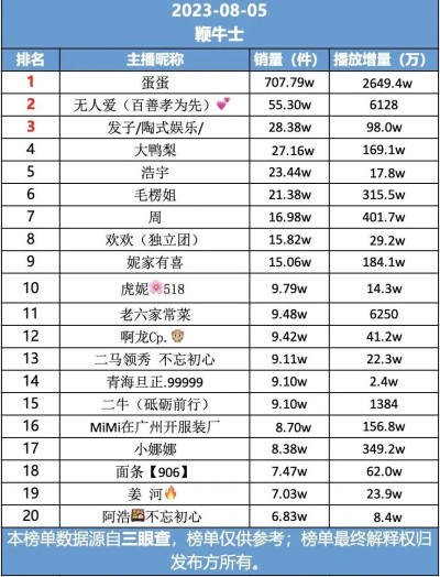 榜單亮點:1、小楊哥因近日在直播間回應2000萬捐款爲稅後款項而獲得網友們點贊,一句「取之於名,用之於民」可以說是賺足了口碑,這也給直播間又一次帶動了人氣值和信任值。從5日的直播銷售額來看,小楊哥的成績一騎絕塵。