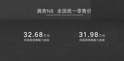 8月5日,騰勢N8 正式上市,新車共推出2款車型,售價區間爲31.98-32.68萬元。新車作爲騰勢品牌煥新後的第三款、也是N系列的第二款車型,定位中大型SUV。擁有6/7兩種座椅布局,可滿足更多消費者的需求。
