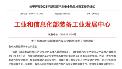8月1日,工業和信息化部裝備工業發展中心發布《關於开展2023年新能源汽車安全隱患排查工作的通知》。通知提出,同一車型出現3起及以上起火燃燒事故的,企業應統計相關車型產品配置和技術特徵信息,制定相關車型安全隱患排查計劃,落實處置措施。