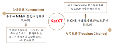 KarXT是一種口服的M1/M4首選毒蕈鹼激動劑,也是並具雙重機制的新式藥物,由xanomeline和trospium chloride兩種有效成分構成,不像以往的抗精神分裂症藥物多針對多巴胺能和血清素能通路。如果順利獲批,KarXT將成爲50年來首個治療精神分裂症的新種類藥物。