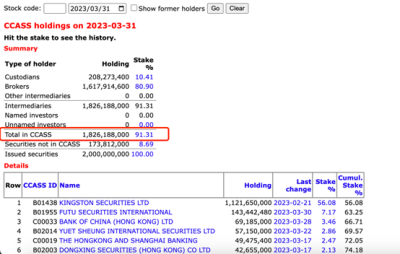 3、注意股權集中的風險,投資者可從港交所披露易CCASS內股權的集中程度判斷,若大股東把大部分股票放在同一家券商,可能是將股票進行了質押,有出現被斬倉引致股票暴跌的可能。同時可觀察香港證監會網頁的“股權高度集中公布”。