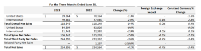 從業務來看,2023年第二季度牙科相關業務營收1.19億美元,同比增長0.4%。其中美國市場營收0.69億美元,同比下降1.3%;國際市場營收爲0.49億美元,同比增長2.9%。