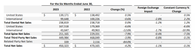 2023年上半年牙科相關業務營收2.39億美元,同比基本持平。其中美國市場營收1.39億美元,同比增長0.5%;國際市場營收爲1億美元,同比下降0.6%。