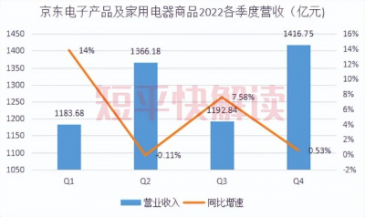 進一步來看,京東電子產品及家用電器商品收入僅在2022年Q1實現雙位數的同比增長,而Q2收入則同比有所下滑,Q3收入因爲“京東618”同比增幅7.58%,Q4收入僅同比增幅0.53%,幾乎可忽略不計。