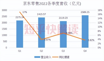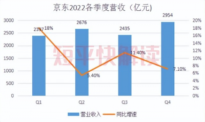 分季度來看,京東2022年Q1至Q4,實現營業收入分別爲2397億元、2676億元、2435億元、2954億元,同比分別增長18%、5.40%、11.40%、7.10%,總體呈現下滑態勢。