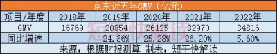 談及電商平台,成交總額(GMV)是一個重要的指標。2018年至2022年,京東GMV呈現增長態勢,分別爲1.68萬億元、2.09萬億億、2.61萬億元、3.3萬億元、3.48萬億元,同比增速基本保持在20%以上,而2022年同比增速僅爲5.6%,增速放緩明顯。