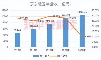 拉長時間來看,2018年至2021年,京東營業收入同比保持快速增長態勢,分別爲4620.2億元、5768.88億元、7458.02億元、9515.92億元,同比分別增長24.51%、24.86%、29.28%、27.59%。對比來看,京東2022年營收同比增長率不僅創下5年新低,而且直接從兩位數增長迅速下滑至個位數增長,降幅不可謂不大。
