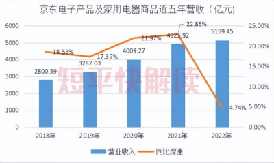 2018年至2022年,京東電子產品及家用電器商品的收入持續增長,分別爲2800.59億元、3287.03億元、4009.27億元、4925.92億元、5159.45億元,前四年均實現雙位數增長,同比增速分別爲18.53%、17.37%、21.97%、22.86%,而2022年同比增速僅4.74%。