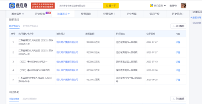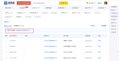 商商查風險信息顯示,目前恆大地產集團有限公司存在數百條被執行人信息,被執行總金額超430億元,同時,還存在數百條限制消費令、終本案件以及股權凍結信息,並數十次被列爲失信被執行人(老賴)。