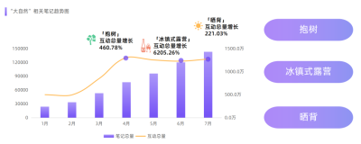 調研平台1-7月“大自然”相關筆記數據發現,對「走出去」的渴求已經加速如抱樹(單月互動增長460.78%)、冰鎮式露營(單月互動增長6205.26%)、曬背(單月互動增長221.03%)等話題走紅。