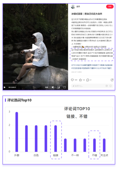 千瓜數據顯示,知名品牌安踏投放的初級旅遊達人@露霏 的筆記《冰鎮式露營 | 把自己歸還大自然》,內容爲峨眉山溯溪攻略,產品種草完美融入自然環境,互動量超1800,評論熱詞TOP10出現“鏈接、不錯”等,效果顯著。