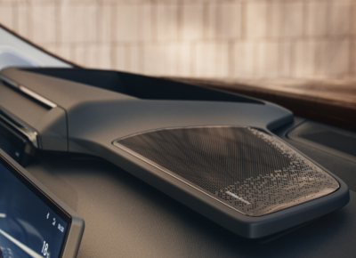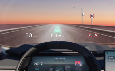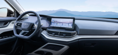 中控台上方的設計官方稱之爲“科技懸浮島”,它集成了一塊巨大的AR-HUD設備以及揚聲器的中音喇叭。這塊AR-HUD在10米視覺距離上能投92英寸的投影面積,覆蓋三個車道,分辨率也達到了2K,主要支持ADAS、AR導航等信息。