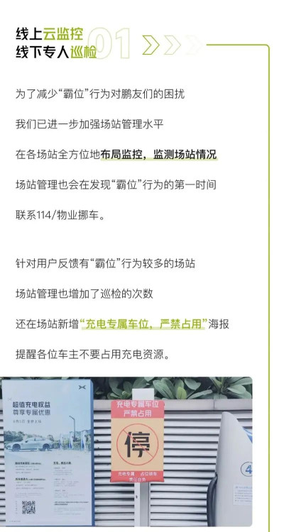 如果發現有車主“霸位”,小鵬汽車會通過信息、電話等方式提醒車主,並從佔位开始,按照1元/分鐘進行收費。如果車主不按時繳納費用,將影響其在小鵬自營充電站的正常使用。