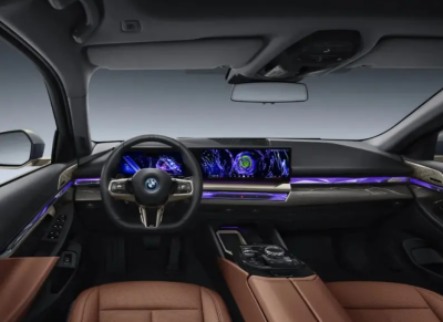 內飾方面,寶馬i5同樣採用了最新的家族設計風格。比如12.3英寸儀表+14.9英寸中控屏的聯屏設計,還有新樣式的方向盤以及能分色顯示的環抱式交互氛圍燈帶。新車後排座椅不僅通過“加長”和“加厚”,還首次爲前排座椅定制了舒適軟枕。前排座椅靠背上印刻有漢字“五”專屬徽標。