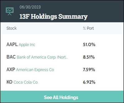 伯克希爾的持倉集中度依然很高,前十大持倉股佔到總持倉的91.26%。截至第二季度末,伯克希爾80%的股票投資組合集中在五家公司:蘋果、美國銀行、美國運通、可口可樂和雪佛龍。