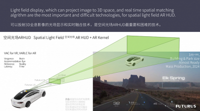 我們目前申請了很多HUD技術專利,已經有6台路試車輛,實車測試數據累計超10萬公裏。我們2023年推出的光場AR-HUD產品,搭載了我們自己獨家的AR Kernel渲染引擎。硬件和軟件相對市面的產品有非常大的提升,硬件有縱深感,軟件也做了大量優化,可以實現物理世界和數字世界的實時融合。多個客戶的項目正在定點過程中,預計2024年底到2025年初陸續實現大規模量產上車。
